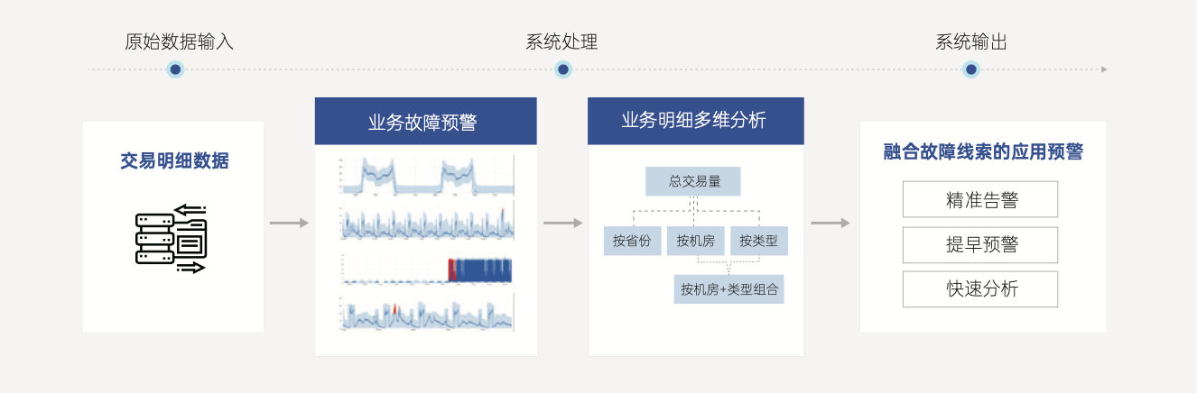 本场景通过智能检测技术对业务黄金指标进行异常检测,准确识别业务指标时序曲线的反常变化,及早发现故障和风险;此 外在应用告警关联业务明细多维分析出的故障线索,快速判断故障影响范围,定位异常根因维度。整体提升告警准确率,实 现业务故障预警,同时辅助管理员进行故障排查,缩短故障发现和业务系统恢复时间。