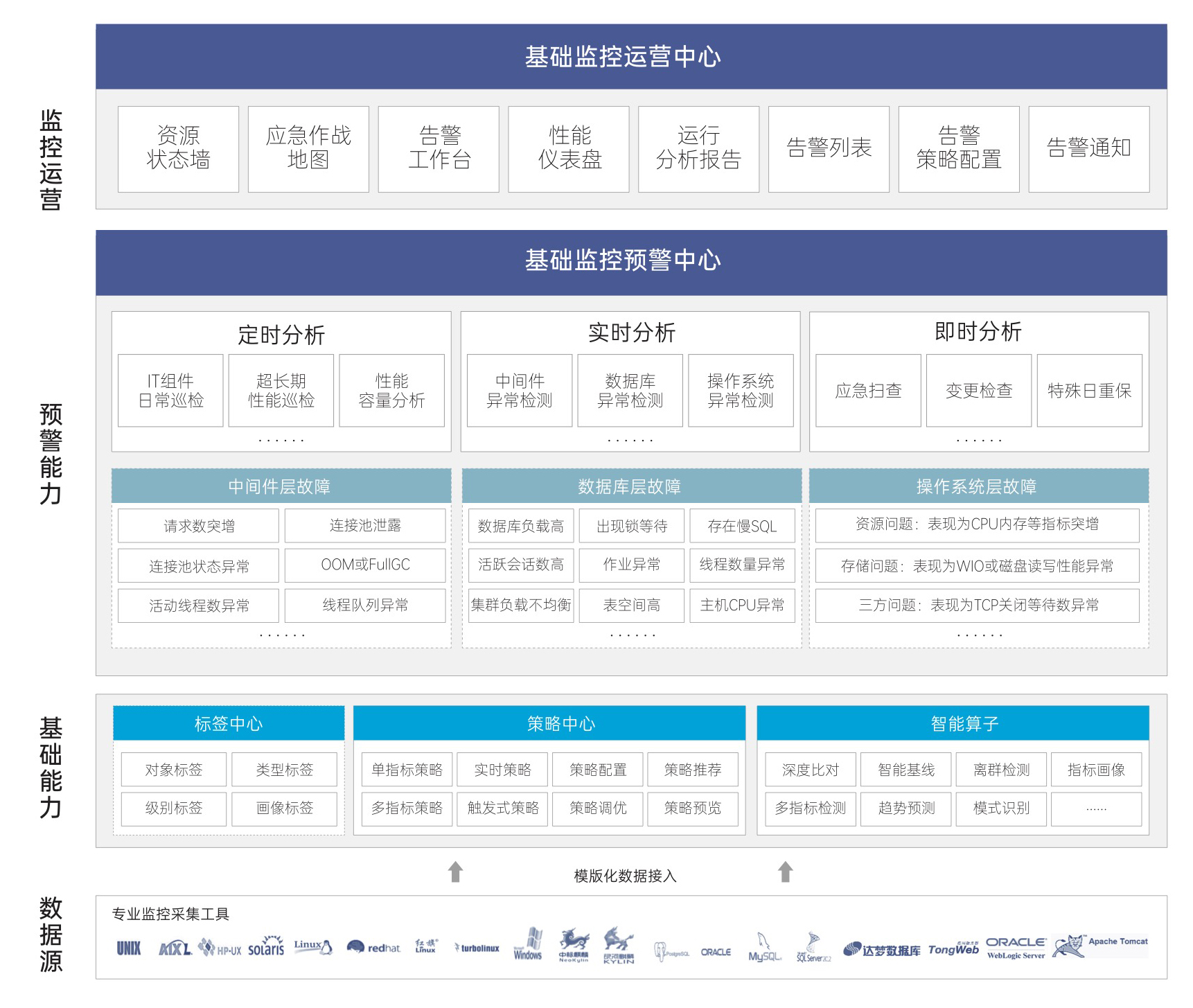 通过接入IT组件指标,并融合数据洞察手段和人工智能算法,系统实现面向海量IT监控数据的精准异常检测,帮助IT运维人员更早的进行IT组件全面高频故障预警,准确发现各IT组件风险隐患,做到防患于未然,避免了传统静态阈值带来的漏报、误报困扰。