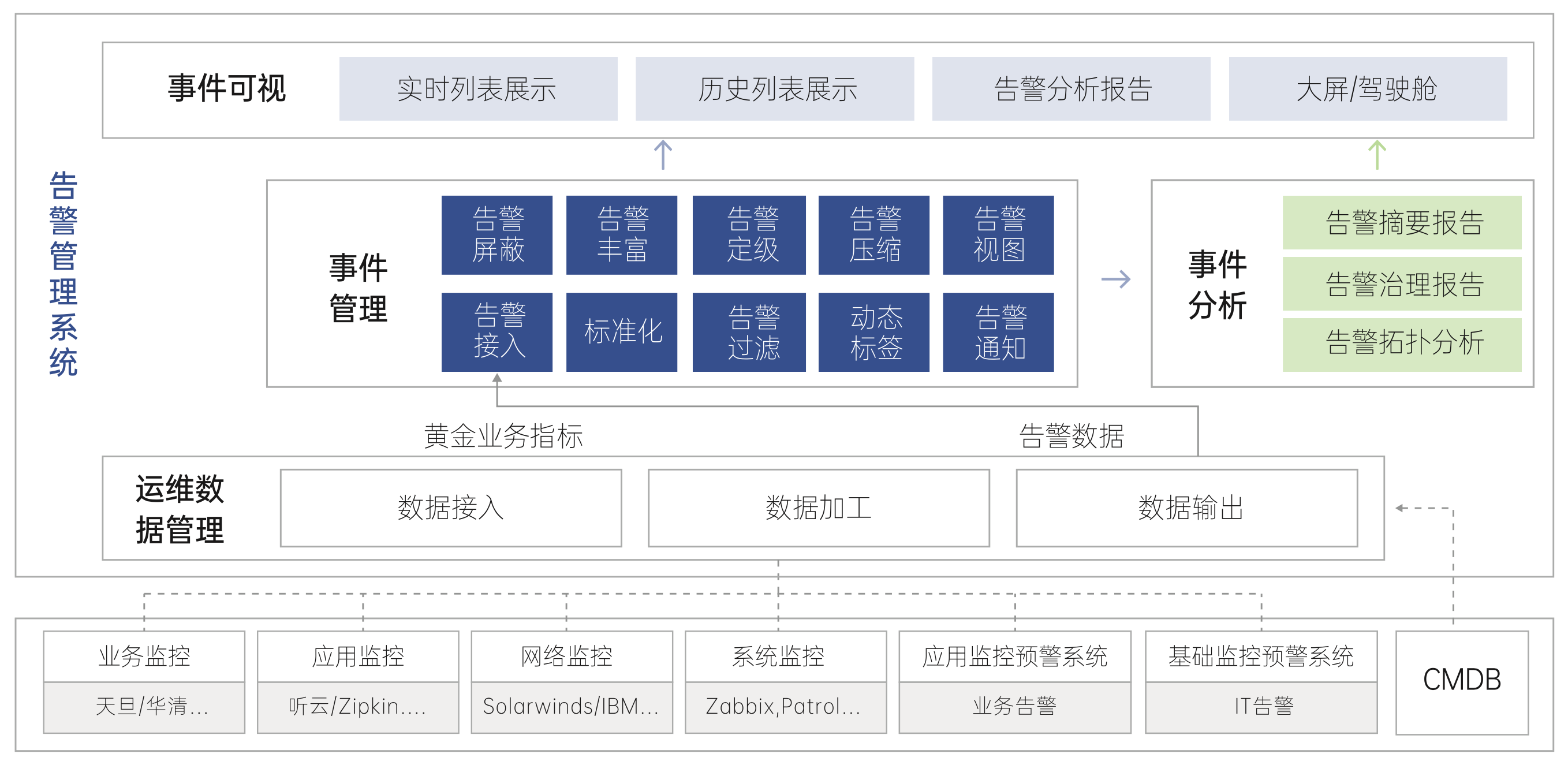 系统对多源告警进行过滤、屏蔽、压缩、丰富、定级、处置、跟踪,从而实现告警全生命周期管控。基于必示智能告警数据分析算法,系统对发生的告警做特征画像标签、摘要分析、质量评估等分析,帮助一线、二线运维人员在大量告警中关注高优重点告警、可疑故障组件和应用,解决告警多无所适从的困境,提高运维效率。