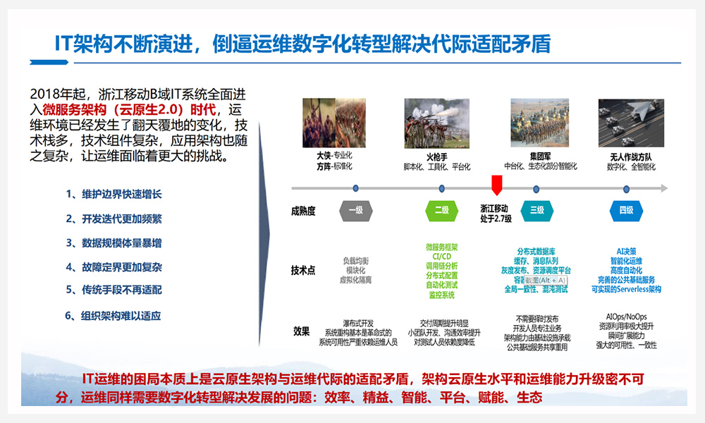 作为一个从事运维工作十多年的“老兵”,感激这个时代的技术进步,特别是云原生、人工智能、大数据技术,让我们运维人能够经历从传统运维到当下数字化运维的蝶变,从而不断探索运维人的价值。近日,我们浙江移动原有的两个传统运维部门「应用运维部」、「平台运维部」正式更名为「技术运营部」和「技术保障部」,更加坚定了我们以技术为驱动的运维数字化转型的理想信念。很高兴今天能够借此机会与业界的各位专家、同仁分享浙江移动运维转型实践的经验。