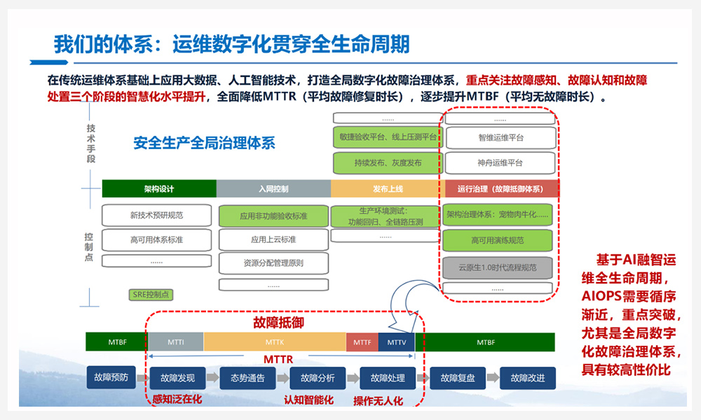 纵观运维的整个生命周期,安全生产周期从前端架构设计、路网管控、发布上线、再到故障态的运行制定,这是一个运维端到端的闭环。在这一闭环中,所有的节点对运维都很重要,都需要转型升级。而AIOps的落地需要循序渐进,因此我们初期首先将重心聚焦在故障的运行治理上。关注MTTR(Main Time to Repair),即平均故障的修复时长:从故障的感知、发现,分析、定位,到故障的处理,这一过程是目前浙江移动聚焦的领域范畴。
