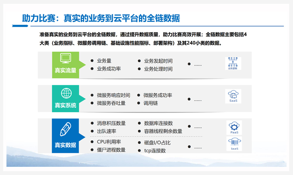 本次大赛浙江移动将为所有选手提供真实的环境、真实的流量、真实的数据。我在上文提到的运维数据、我们的运维数据中台都是基于我们真实的环境,包括真实的流量、真实的系统、真实的数据、微服架构端到端调用链数据、前端所有业务的黄金指标,以及后端平台所有网元的指标,这些数据我们都可以提供给本次大赛的参赛选手。这些数据将近240个小类,是我们非常核心的资源。期待基于我们的数据,可以让各支参赛队在本次大赛中更好地展现实力和水平。