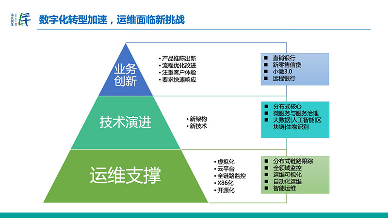 总体来说,随着产品推陈出新和流程优化改进,银行业务越来越注重客户体验,能够快速响应客户需求,提供更优质的银行服务。而这些服务和系统都运行在数据中心,数据中心的各种设备、技术栈和系统关系越来越复杂。从物理服务器到虚拟化云平台,从商业产品到开源技术,从集中式架构到分布式架构,这些都给运维带来了更大的挑战。如何应对新挑战是我们当下面临的严峻课题。