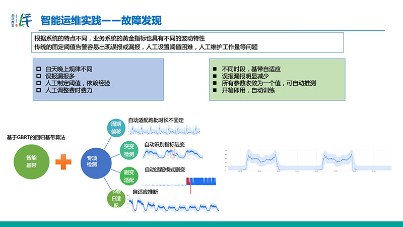 其实,做故障发现不是一件容易的事情。我们要做故障发现算法一定要适用于各个系统,但银行各个系统的运行特点不一样,比如性能指标每天的曲线、每周的曲线、每月的曲线都不一样,所以做智能运维算法的时候要做很多考量,比如考虑系统批处理时间的影响,识别一些指标的陡升陡降,因为一些业务的关停或新开,可能就会出现陡升陡降的情况。再比如春节、国庆等节假日,指标与平时不一样,也需要算法有效识别出来,保证故障异常发现的准确性。这规避了传统监控方法要设置不同的阈值,而且阈值要根据业务变化进行人工调整。现在我们直接用智能算法就能检测业务KPI的异常。