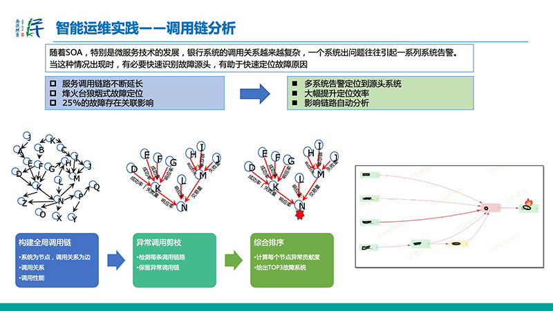 民生银行异常检测和故障定位主要聚焦两个方面:横向定位故障系统,定位到哪个系统出了问题;纵向定位故障原因,找到系统中哪个组件出了问题,原因是什么?