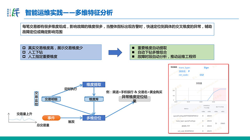 从下图右下方可以看出,通过多维特征分析,可以直观看到异常交易类型是什么、调用交易的源系统是哪一个、调用返回码是什么。我们通过智能运维算法直接把多维数据分析结果显现出来,省去逐步查看日志、查看系统监控指标、分析数据和原因的过程,节省了大量的时间和人力。