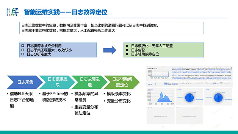 这是我们做日志故障定位的思路,当出现问题的时候,通过日志故障定位功能分析日志是否异常,是哪个组件出现了异常,再根据异常做进一步处置。