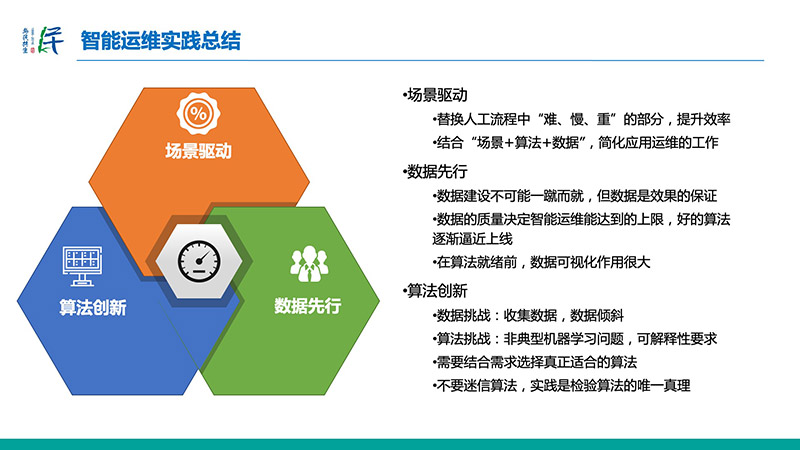 最后是场景驱动。刚开始做智能运维难度很大,因为这是一个全新的课题,所以我们当时决定通过场景驱动的方式,找到日常运维工作中特别难、特别慢、特别繁琐又亟需提升效率的场景,集中精力去突破,通过“算法+数据”的方式来简化运维工作。