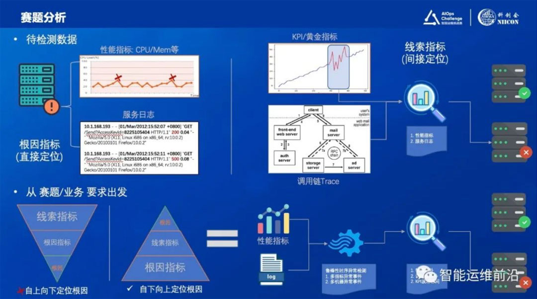 根据赛题的要求,返回的故障根因只能包含性能指标和服务日志,因此我们将这两种数据作为直接定位的“根因指标”,而将黄金指标和调用链数据的分析作为“线索指标”。常见的故障定位通常为“自上而下”顺着线索指标下探到根因指标。由于此次赛题中根因指标的波动不一定会引起上游黄金指标的异常(如水平扩展较多的A系统),我们这里的首个创新为采用“自下而上”的方式去伪存真,直接分析根因指标并辅以线索指标进行验证,见图1.