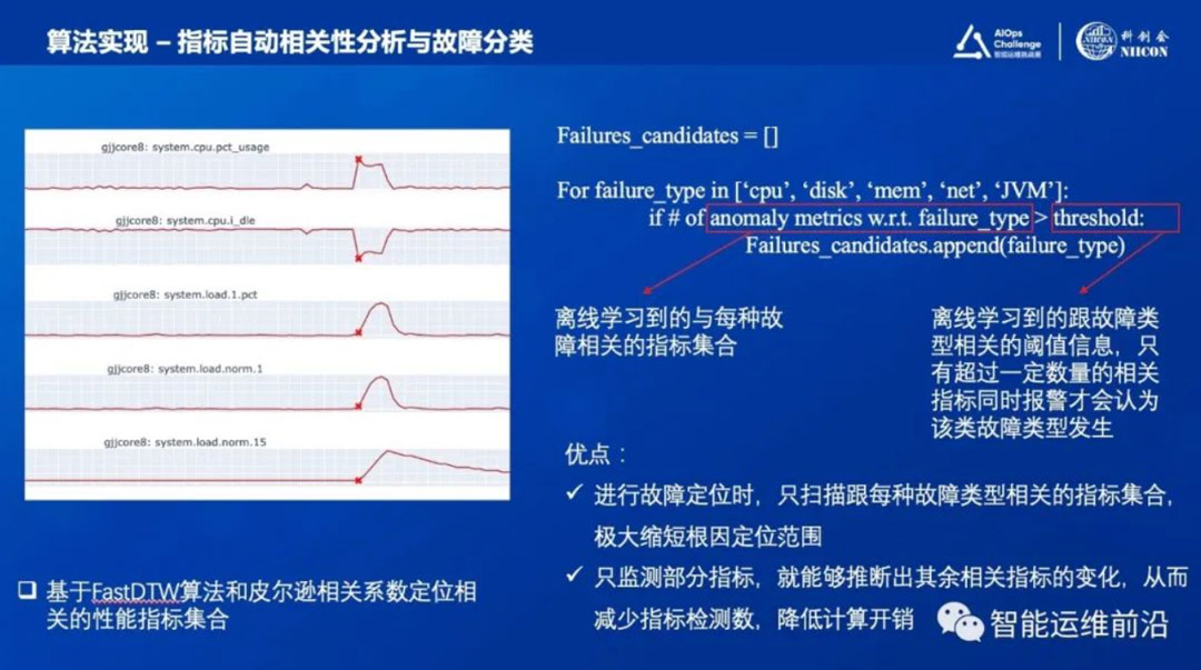 如第2小节中所述,赛题涉及的性能指标达数以千计,每次都进行全盘扫描不仅耗时严重,也会为离线参数调优带来挑战。为了缩小在线根因定位的指标搜索范围,我们提出了一套自动的指标相关性分析和故障分类算法。