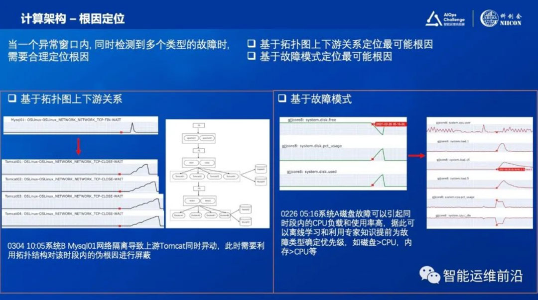 同时,我们也观察到在系统的拓扑结构上,可能同时存在多个故障实体(cmbd),有上下游关系。这种时候要根据系统的拓扑结构定位到真正的上游实体,如图5左侧B系统的Mysql01网络隔离导致上游Tomcat异动,此时应该提交Mysql01为真正的根因。类似地,我们将拓扑的结构信息也作为先验知识,并设定优先级以在多组cmbd实体异常时进行真正的根因定位。