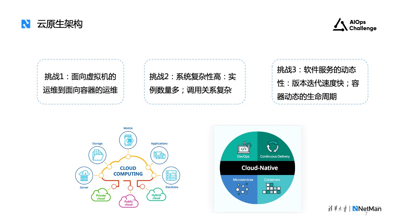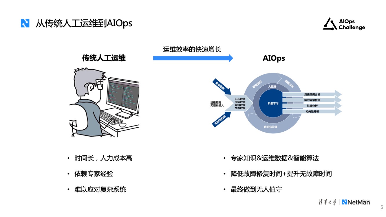 第二个趋势是传统人工运维逐渐向智能运维转变。传统人工运维是基于运维人员的领域知识,人工分析故障原因或者编写自动化脚本进行检查。这一过程耗费大量的时间和人力成本,且人工运维难以应对系统规模增大和复杂度增加带来的挑战。