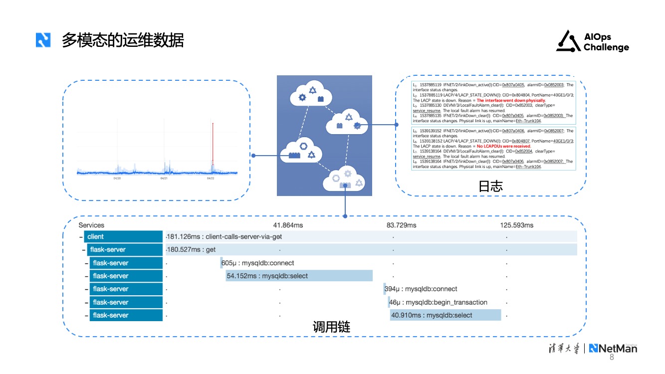另一个挑战是多模态的运维数据。运维数据类型较多,比较典型的包括指标、日志和调用链。指标也被叫做KPI,能够反映业务状态和机器性能的时间序列数据。日志是一种程序打印或者执行代码输出的非结构化文本。调用链则是在系统完成一次业务调用的过程中,把服务之间的调用信息连接成的一个树状链条。