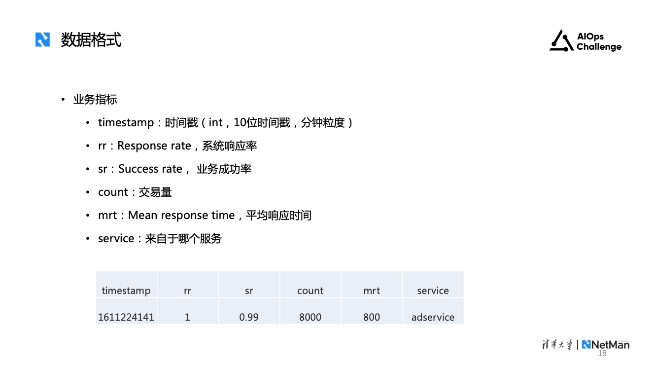 为了贴合实际,本届挑战赛基于微服务系统收集了海量多模态监控数据,包括指标日志和调用链。指标又包括业务指标和性能指标,业务指标共有4种,性能指标有400种左右。每天的数据压缩后大约有800兆,和实际运维场景的数据量接近。在未来发布数据时,我们会配备详细的数据说明文档,方便大家理解这些海量监控数据。