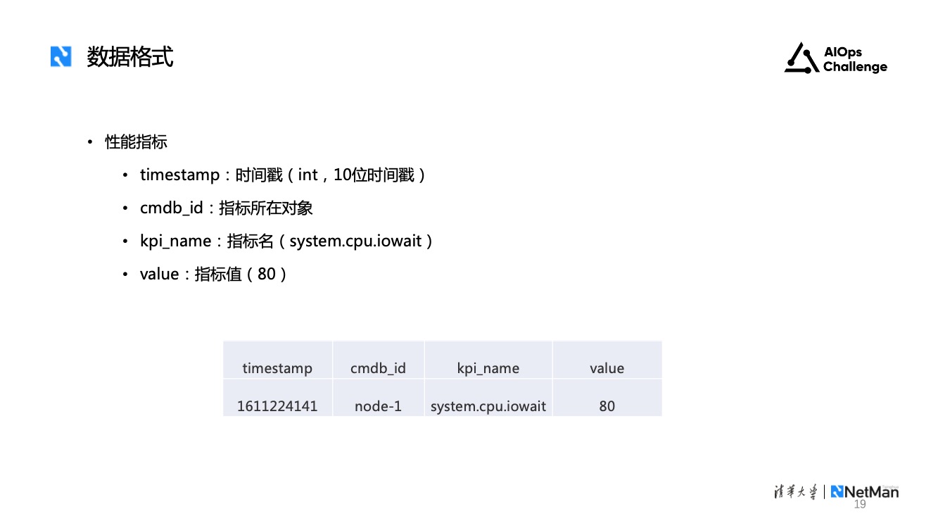 - 性能指标,记录基础设施层面的性能信息。它的格式包括时间戳、cmdb_id、kpi_name和value。由于K8s的部署架构不同于去年的虚拟机部署架构,所以这里不同类型的性能指标对应的cmdb_id格式可能不同。