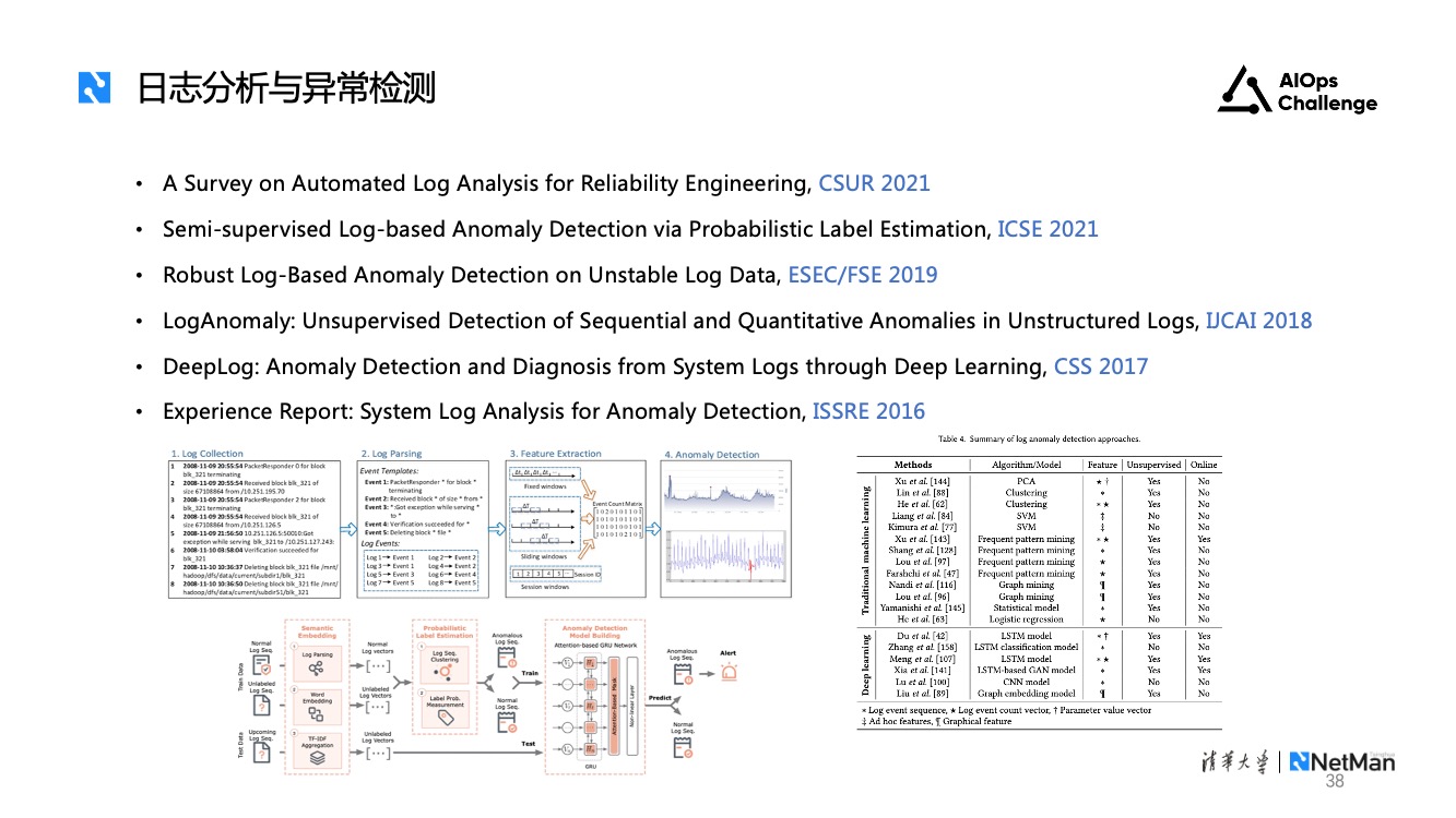 日志异常检测。目前学术界有很多研究,早期的工作大多采用传统统计方法,比如PCI聚类和不变量挖掘。近几年有很多基于深度学习的日志异常检测工作,分别从不同的角度进行完善。