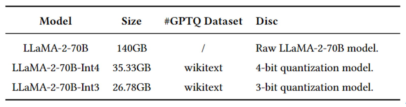 此外,为了了解不同量化参数对模型性能的影响,我们评估了LLaMA-2-70B的两个量化版本。具体而言,我们使用LLaMA-2-70B的带有3位和4位量化参数的GPTQ模型。