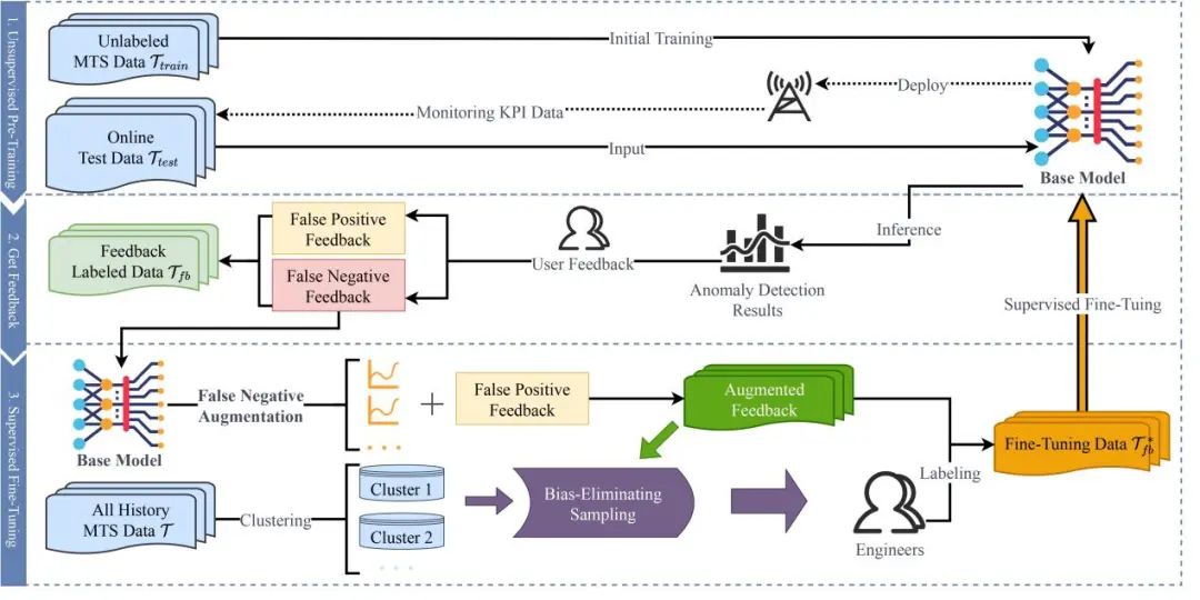 AnoTuner的整体工作流程如图 2所示,分为三个阶段:无监督训练和部署、收集反馈以及监督式微调。在反馈收集过程中,运营商定期提供有关异常检测方法报告的误报或漏报的反馈。在实际环境中,这个周期通常为一周。在基于反馈的微调阶段,AnoTuner经过两个关键步骤:漏报反馈增强和二阶段主动学习。