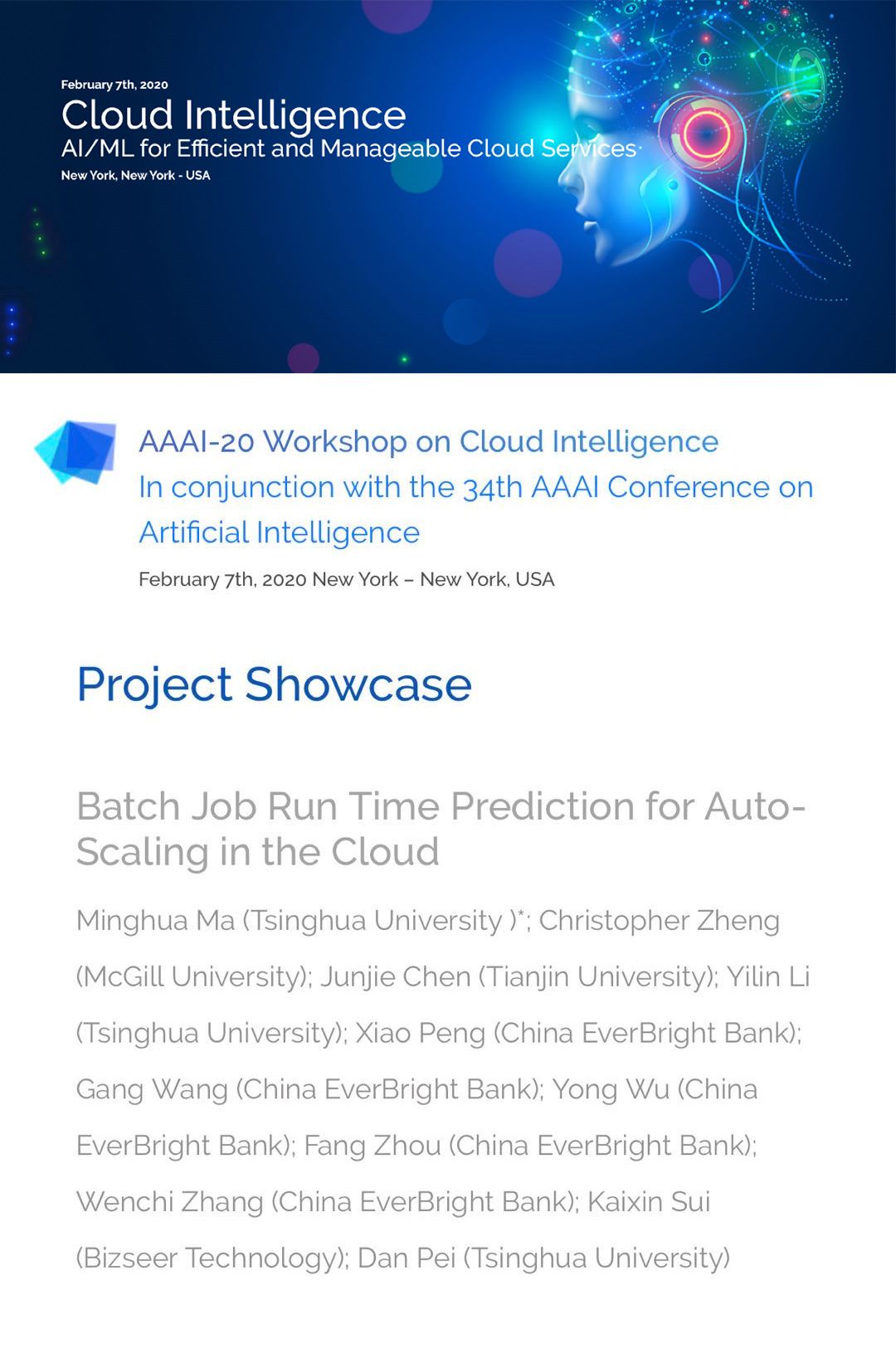 由必示科技携手清华大学、麦吉尔大学、天津大学、光大银行信息科技部合作完成的项目展示论文《批处理任务时间预测》(Batch Job Run Time Prediction for Auto-scaling in the Cloud)获人工智能领域顶级国际会议AAAI-20 Workshop on Cloud Intelligence收录。AAAI-20(全称The Thirty-Fourth AAAI Conference on Artificial Intelligence)由美国人工智能协会主办,被中国计算机学会(CCF)列为A类会议。此次会议在纽约举办,有效投稿7737篇,最终录用1591篇,总录用率约为20.6%。本文发表于2020年AAAI的云智能研讨会,以下是主要内容分享,欢迎共同探讨。