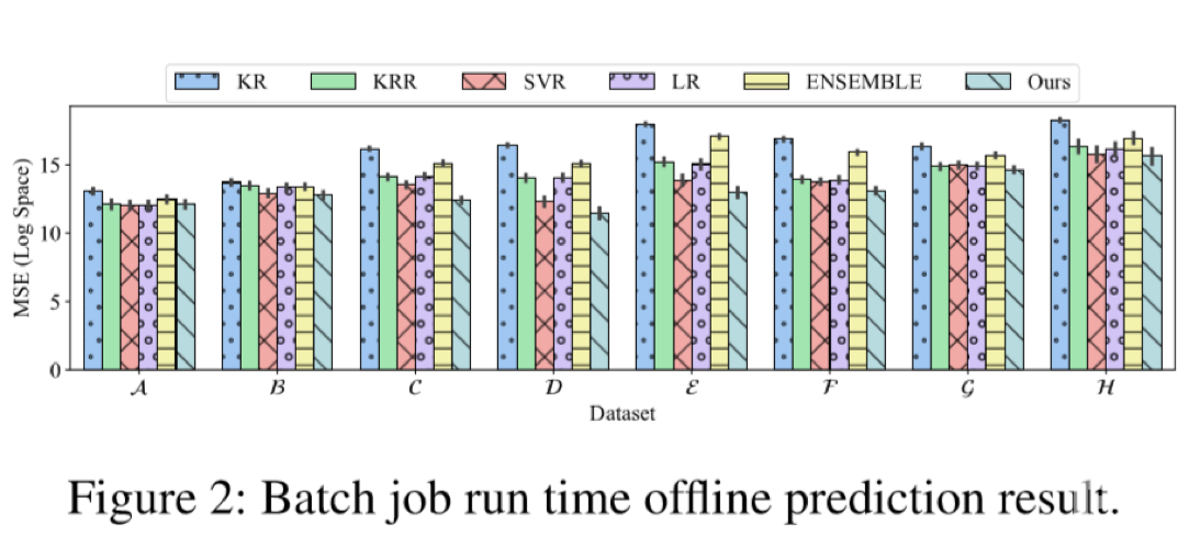 本文根据数据的变异系数(CoV)分布,从银行的样本中选择了八个批处理任务的数据集。如表1所示,数值越大,数据集的波动越大,预测就越困难。本文实现了Batman的原型,并根据其他五种基线方法对离线预测模型进行了评估,以均方误差(MSE)的平均对数作为度量标准来衡量这些预测模型的准确性。MSE的值越小,预测精确度越高。使用一个小时的预测时域来进行试验。如图2所示,将Batman和五种算法比较,即核回归(KR)、核岭回归(KRR)、epsilon-SVR、集成方法(KRR、SVR、LR)。可以看出,Batman框架比其他所有算法在数据集上表现都要好。使用Batman框架,可以稳健地预测批处理任务的运行时间。